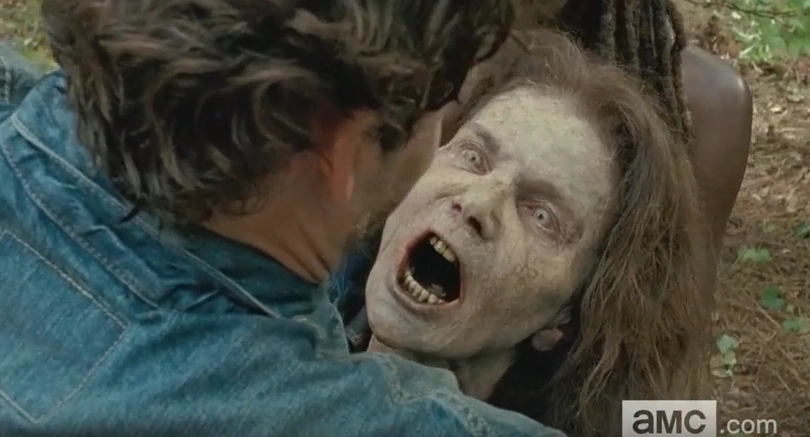 At the meeting, Deanna notices that Rick is not in present, escalating her distrust of him and the group. Deanna reveals what Gabriel told her about Rick's group, which angers Maggie, who storms off. Deanna and the others then were shocked when Rick threw a dead walker in front of them and told Deanna that walkers got in because the gate was left open. Spencer notes that he asked Gabriel to secure the gate, and Deanna sends Spencer off to find Gabriel. Pete then appears with Michonne's katana. Reg tries to calm Pete down, only to be slashed across the throat. Deanna becomes hysterical, holding Reg and feeling helpless. Enraged, she says "Rick? Do it". Rick, without hesitating, shoots Pete in the head.